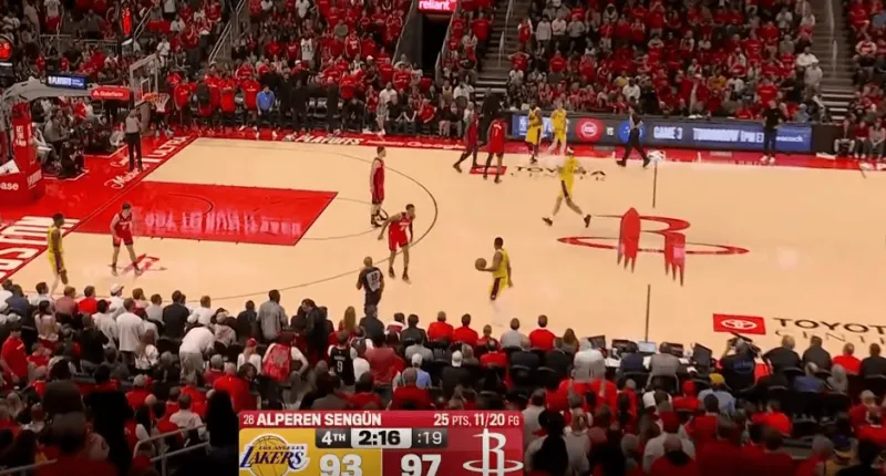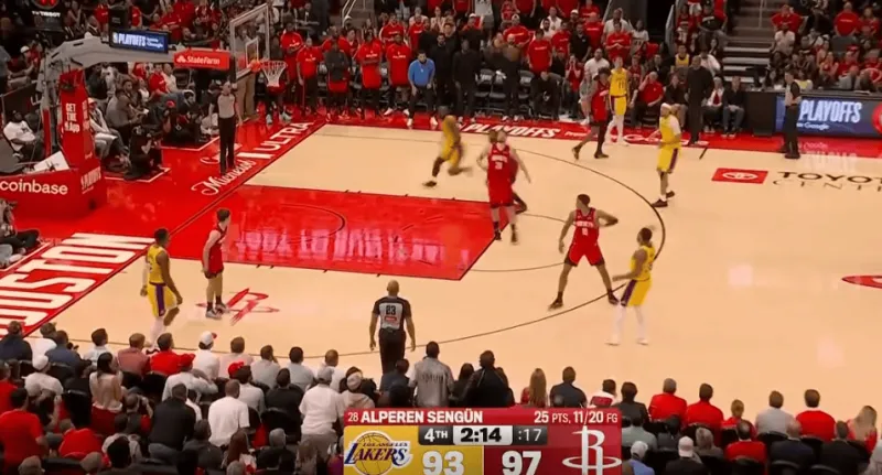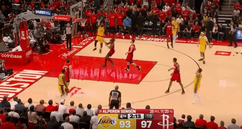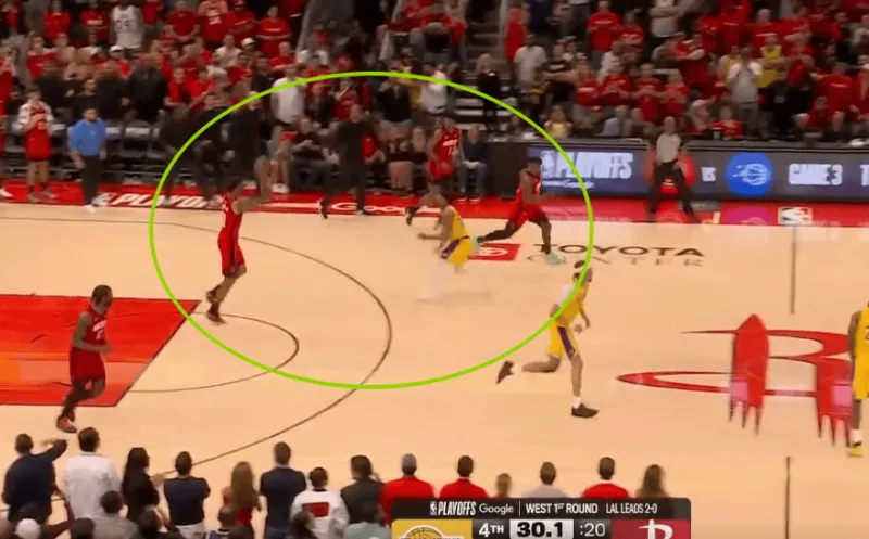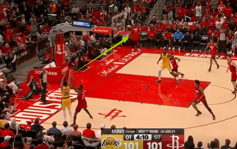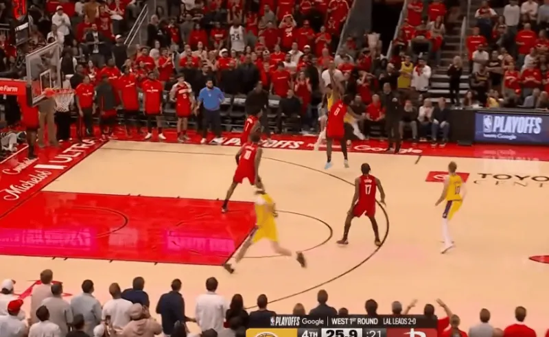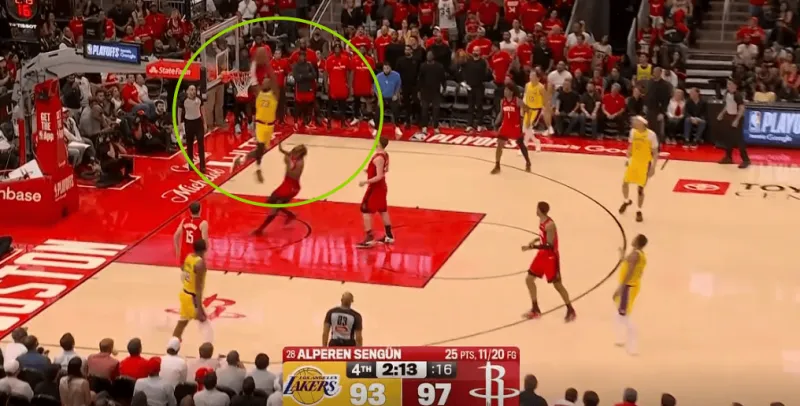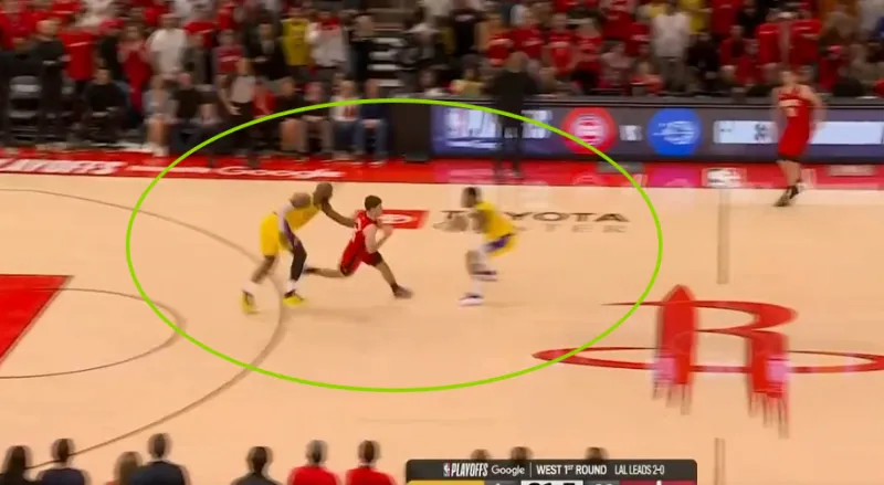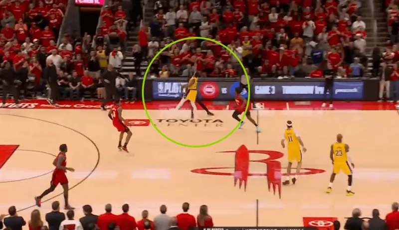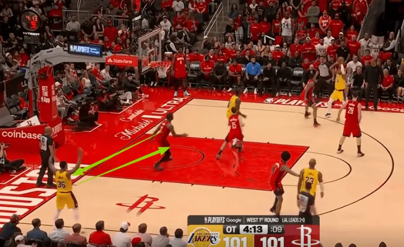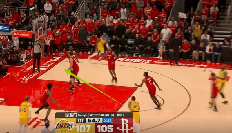 随后顶着阿门、泰特双人夹击运至右侧45°直接出手三分造成泰特犯规,随后三罚全中将比分差距缩小到3分。成为湖人30秒落后6分将比赛拖入加时的关键。