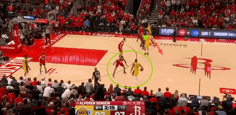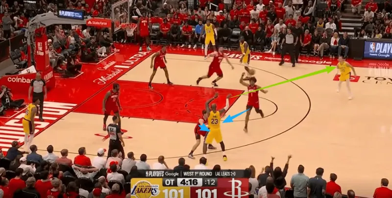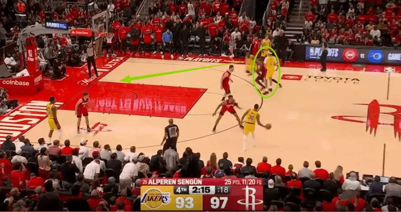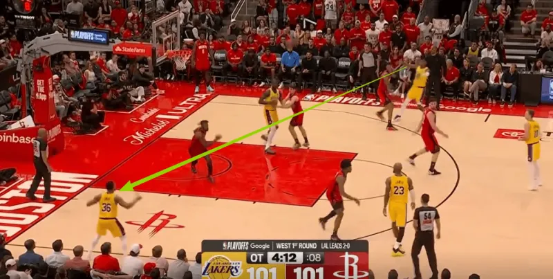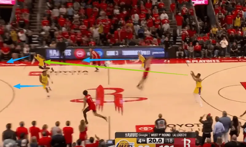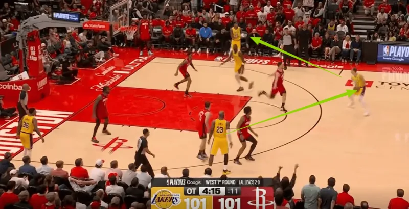 再看第四节关键时刻这颗精彩的长传:斯玛特推进过半场后落位强侧45°持球发牌,弱侧的詹姆斯随即抓“早期进攻阶段”发动传切战术配合:詹姆斯先是佯装借助海斯无球掩护兜至弧顶(执行“Wide Action”战术)误导追防的伊森,在伊森准备挤过掩护墙的瞬间,老詹立即反跑空切篮下摆脱伊森长驱直入如入无人之境(这里的细节是:海斯“Trailer”过半场后留在弧顶准备设置掩护将禁区拉空+八村沉至弱侧底角使得谢泼德成为弱侧的LowMan。),