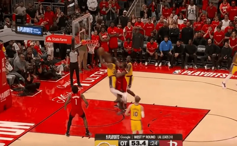 斯玛特直接一记心领神会的高吊传球,助攻老詹空接暴扣将球砸进篮筐。